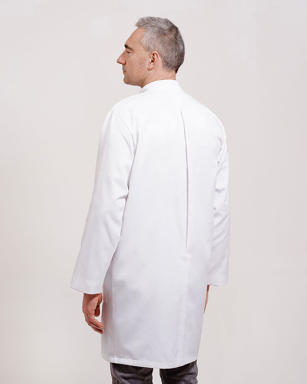 Klasyczny fartuch męski ze stójką i długim rękawem zapinany na bardzo wygodne napy. Fartuch posiada dwie duże, głębokie i bardzo praktyczne kieszenie na biodrach oraz małą kieszonkę na piersi odpowiednią m.in do zamocowania identyfikatora. Krój fartucha nie krępuje ruchów i jest bardzo komfortowy w noszeniu.