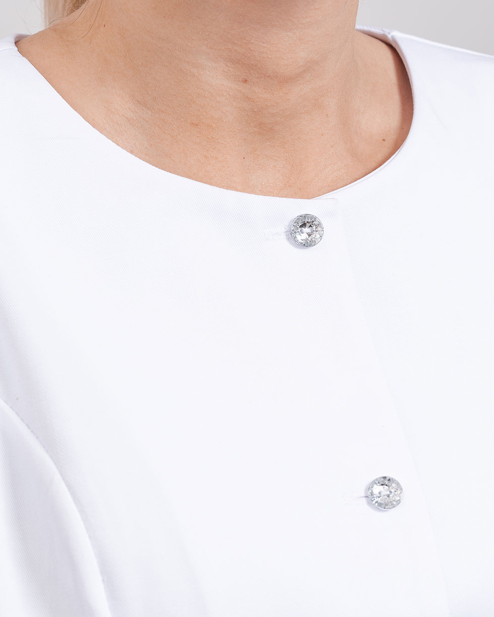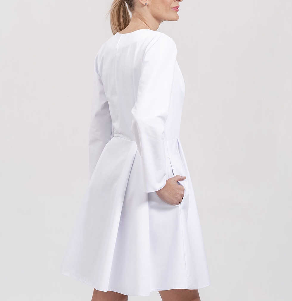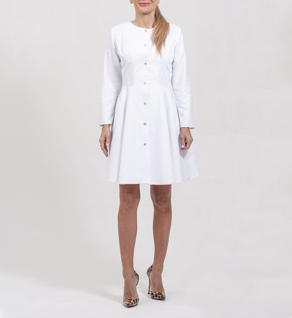 Model Piwonia uszyty jest z pięknie układającego się półklosza. Na całej długości zapinany jest na błyszczące guziki. Gładki dekolt zapewnia komfort noszenia i idealnie współgra z dołem fartucha. Dzięki wysokiej jakości materiału doskonale się układa oraz łatwo prasuje. W tym fasonie możemy poczuć się jak w cudownej sukience. Schowane głębokie kieszenie pomieszczą telefon oraz kobiece drobiazgi.