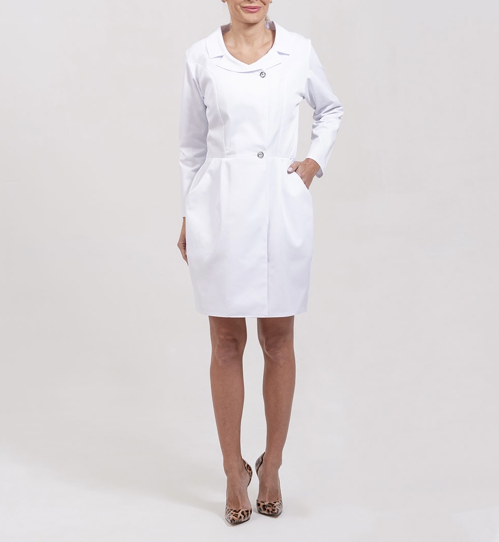 Model Tulipan to kobieca sukienka z dwoma bardzo efektownymi guzikami. Sukienka jest zapinana na zatrzaski oraz dwa ozdobne guziki. Elegancko wykładany kołnierz oraz rozszerzony dół sukienki nadaje jej szyku i elegancji. Podkreśla atuty kobiecej sylwetki, przy czym jest bardzo komfortowy w noszeniu. Posiada głębokie kieszenie, w których zmieści się telefon oraz kobiece drobiazgi.